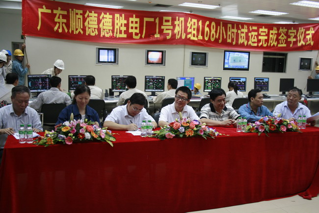 德胜项目1号机组于9月23日完成国家电力建设规范要求的各项试验项目,进入168小时试运行考核。考核期间,广东省顺德德胜电厂1号机组试运指挥部对机组进行检查验收,机组运行参数、相关系统、机炉协调控制等均达到和超过设计考核要求,主机振动指标优良,各项经济、技术指标优良。9月30日16时,广东省顺德德胜电厂2×300MW工程1号机组正式移交试生产。